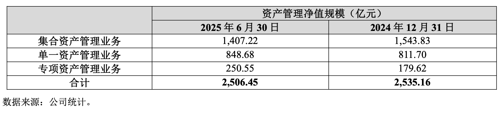 截至6月末,广发资管资产管理净值规模2506.45亿元,较上年末-1.13%;分项看,集合资管-8.85%,单一资管+4.56%,专项资管+39.49%,说明规模更多向定制化、低费率的产品集中。然而,从并表来看,广发证券2025年上半年“投资管理业务”实现营业总收入38.45亿元,同比增长12.22%;营业利润率35.44%,同比增加1.52个百分点。可见,集团层面受公募基金子公司与参股公司向上的盈利分布影响,抵消了券商资管子公司端的下滑。