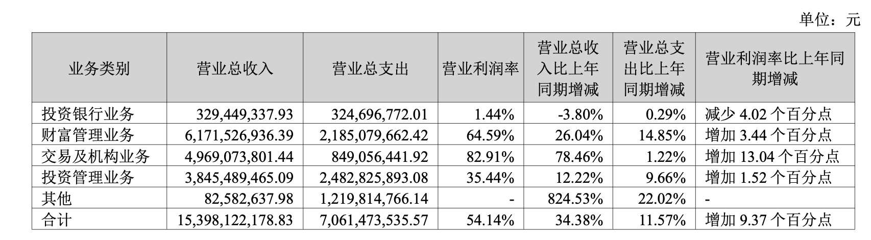 其他业务层面,广发证券上半年财富管理业务收入61.72亿元,同比增长26.04%,利润率为64.59%;交易及机构业务实现收入49.69亿元,同比增长78.46%,利润率更是高达82.91%。相比之下,投行业务偏羸弱,收入仅3.29亿元,同比下滑3.8%,利润率1.44%,同比减少4.02个百分点。而上半年公司营业总收入153.98亿元、归母净利64.70亿元,分别增长34.38%、48.31%,其中靠经纪业务、投资业务拉动明显。
